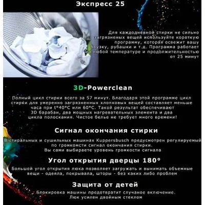 الغسالة Kuppersbusch W 20.0 W برامج/برامج إضافية: برامج غسل من 20 إلى 90 درجة مئوية (عناصر تسخين) تعبر عن برامج الغسيل في أي درجة حرارة تدوم من 20 دقيقة من البرامج القياسية ، والقطن 3D-Powerclean ، والرعاية السهلة ، والرياضة ، والغسل ، والغسيل ، واللطيف ، والغسل المختلط 15 دقيقة. الغسيل ، برامج Clean Clean (برنامج تنظيف الماكينة) برامج القطن البيئي ، Easy Careadditional FunctionSexpress ، ما قبل الغسيل (بقع)) ، تقليل درجة الحرارة ، سرعة الدوران ، توقف الشطف ، غسل ثلاثي الأبعاد - هذا ممكن! ميزات المعدات: عرض ألوان كبير 4.3 "أضلاع الأسطوانة لغسل ثلاثي الأبعاد (تقنية غسل ثلاثي الأبعاد) عزل الضوضاء: صامت بالإضافة إلى LED DRUM Backlight Control Sensor مؤشرًا على تقدم البرنامج والوقت حتى يتأخر البرنامج في البداية حتى 7 أيام من إعدادات الفحم الفردية: إن عكس الفتحة (اليمين / اليسار) قفل طفل Chrome ، ونظام أمان فتحة زجاجية مزدوجة ضد تسرب Aquastop / Foam التحكم في عدم التوازن مؤشر على الإمداد بالمياه / تصريف نظرة عامة على البرامج الخاصة في الهواء الطلق والملابس الرياضية هذه المجموعة مناسبة أو مناسبة لمحتوى Microfiber ، أو من أبرز Microfiber ، أو من أتباع Microfiber أو من مثل Microfiber. الرعاية المنزلية للرعاية المنزلية ، والتي تستخدم حجمًا كبيرًا من الماء ، وهي مناسبة تمامًا لغسل الأدوات المنزلية المصنوعة من الأقمشة والملابس. كما تم تصميم مسببات الحساسية من الأقمشة عن البرامج الإضافية التي تعبر عن الغسيل اللطيف للمتسخة. الفاكهة ، الشاي ، النبيذ الأحمر ، يزداد درجة حرارة الغسيل.